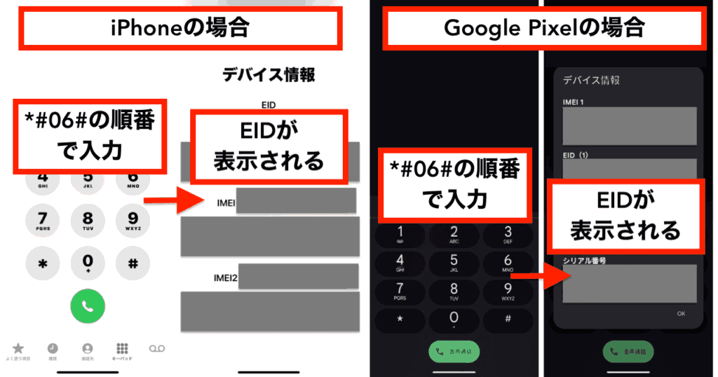 - 電話アプリで「*#06#」とダイヤルし、表示される情報の中に「EID」という項目があるかチェックする(この項目があれば対応機種です)